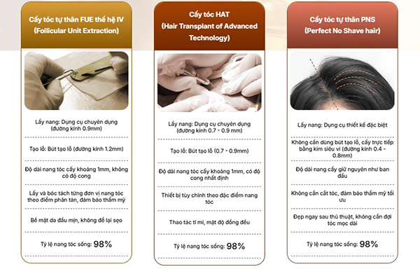 Các phương pháp này cho phép lấy nang, bóc tách và cấy ghép chính xác. Hạn chế tối đa xâm lấn và không để lại sẹo. Nhờ vậy, tỷ lệ nang tóc sống đạt trên 98%, mang lại mái tóc dày khỏe, duy trì trọn đời.